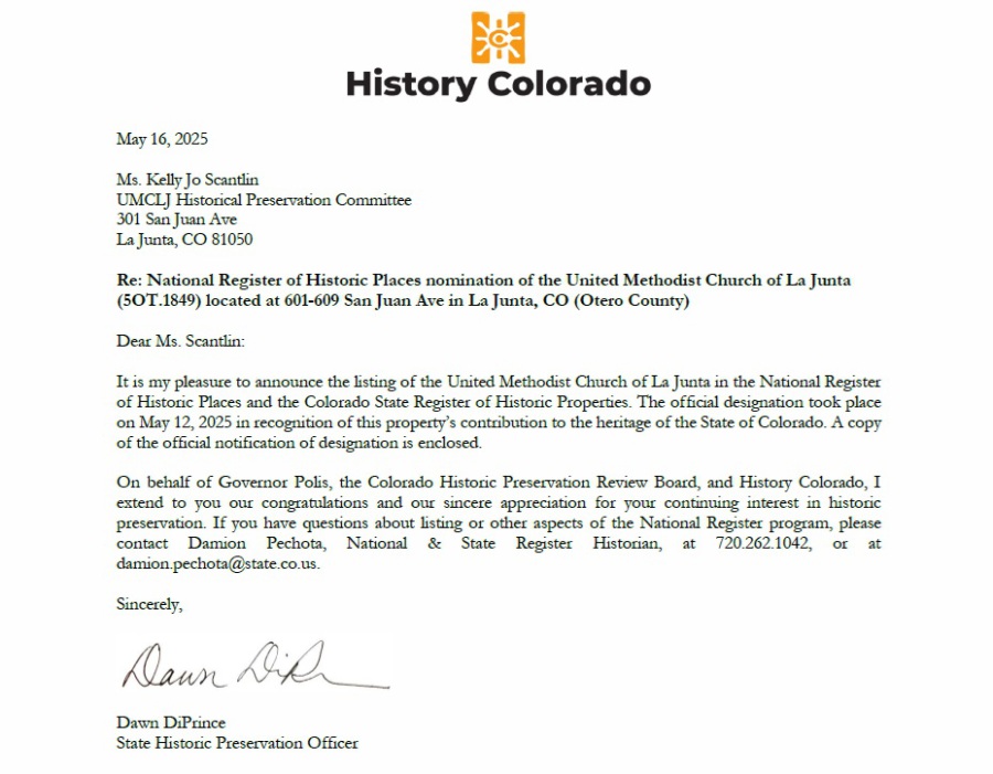 On May 16, 2025 Dawn DiPrince, State Historic Preservation Officer for History Colorado informed the church in a letter of the new status, “It is my pleasure to announce the listing of the United Methodist Church of La Junta in the National Register of Historic Places and the Colorado State Register of Historic Properties. The official designation took place on May 12, 2025 in recognition of this property’s contribution to the heritage of the State of Colorado.”